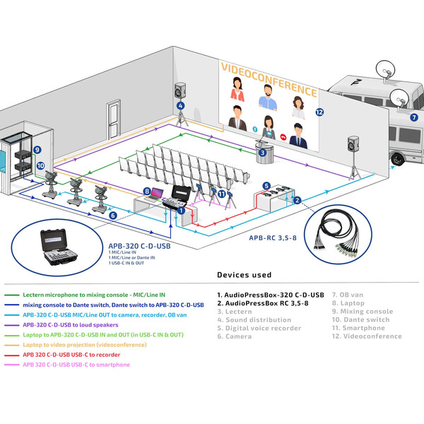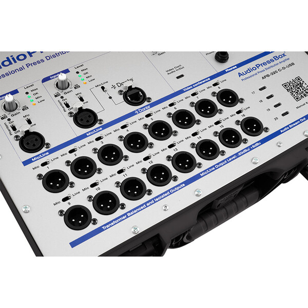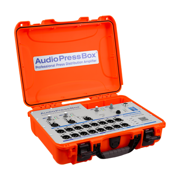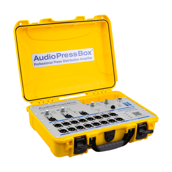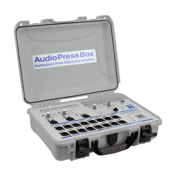 AudioPressBox APB-320 CD-USB е професионално преносимо решение, подходящо за използване при пресконференции на открито. Системата е защитена с кутия Nanuk и разполага с вграден акумулатор. Наличният интерфейс USB-C позволява видеоконферентна връзка за вход и изход при хибридна пресконференция.