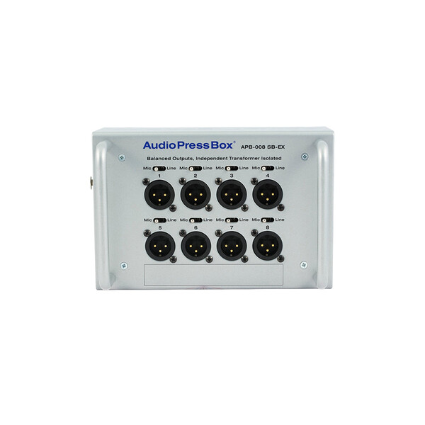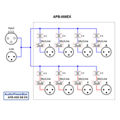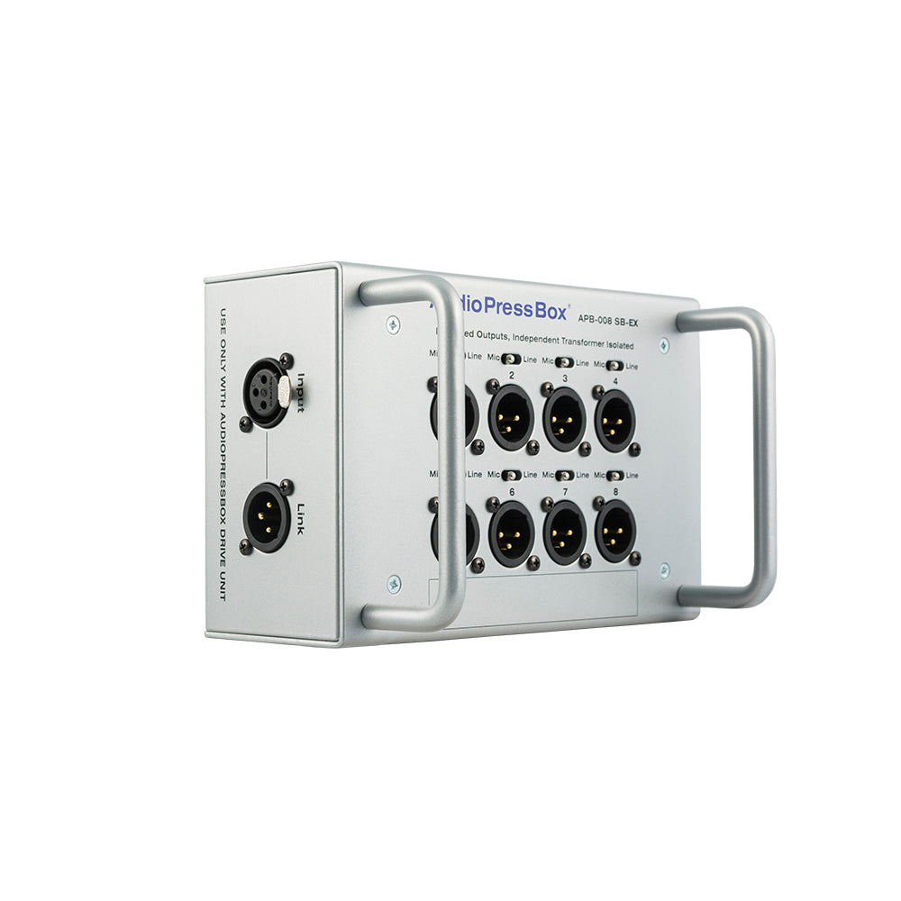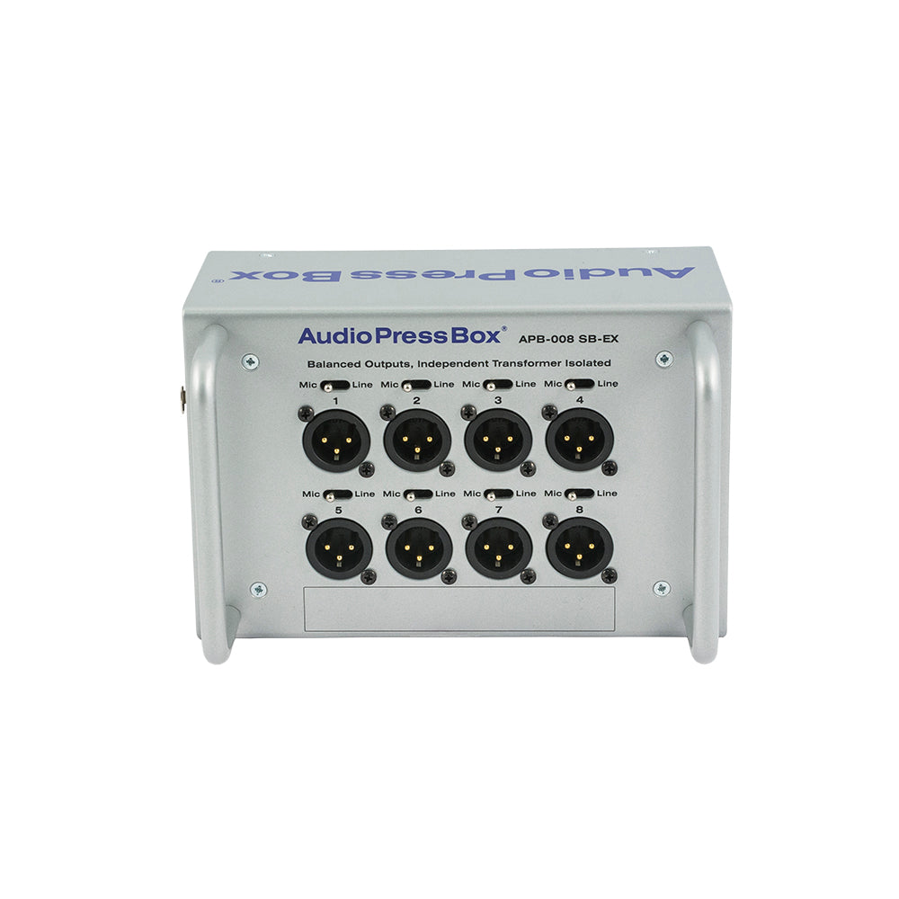 Audio Press Box APB-008 SB-EX е преносим аудио сплитер с 8 линейни/микрофонни изхода. Аудио сплитер Audio Press Box APB-008 SB-EX е подходящ както за пресконференции на закрито, така и на открито.Разполага с 1 линеен вход и 8 линейни/микрофонни изхода. Всеки изход е независим трансформатор, балансиран и изолиран. Audio Press Box APB-008 SB-EX дава възможност за последователно свързване на 3 аудио сплитера на 1 разширителен изход на водещото устройство, което създава общо 24 линейни/микрофонни изхода. Предимство е факта, че общата дължина на кабела във веригата може да достигне до 500 м, като по този начин може да се покрие всякакъв вид или форма на помещение.
