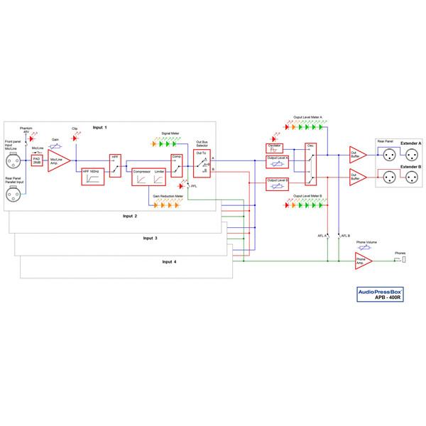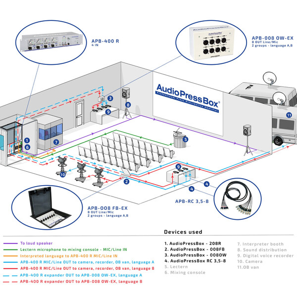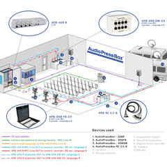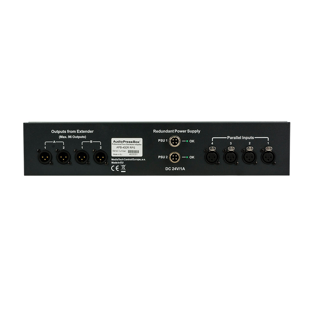 Професионален активен модул AudioPressBox APB-400 R-RPS е основно устройство за AudioPressBox аудио суичове. Разполага с 4 MIC/линейни входа (A,A+B,B). AudioPressBox APB-400 R-RPS е подходящ за употреба при двуезични пресконференции, тъй като разполага с 2 отделни канала A и B. Всеки вход може да бъде насочен към канал A или канал B или и двете едновременно. Разполага и с 4 буферирани разширителни изхода (2x A и 2x B) и може да захранва допълнителни 96 Line/MIC изхода. По този начин можете да маршрутизирате 4 отделни входа към до 96 линейни/микрофонни изхода. Всеки един от аудио суичовете на AudioPressBox е съвместим с AudioPressBox APB-400 R-RPS.
