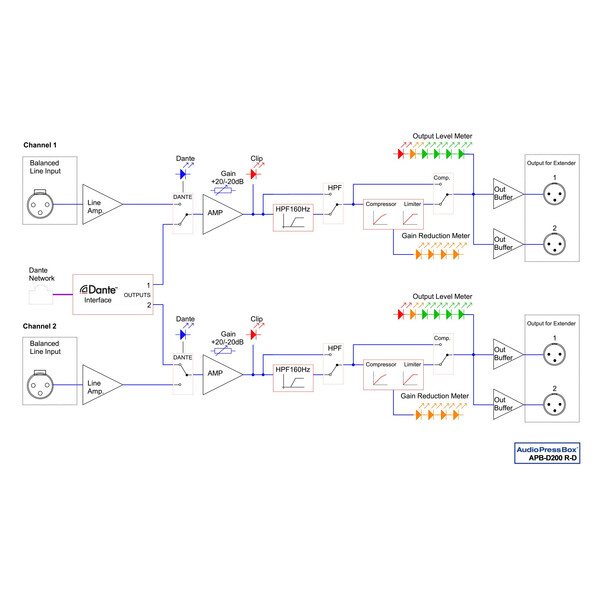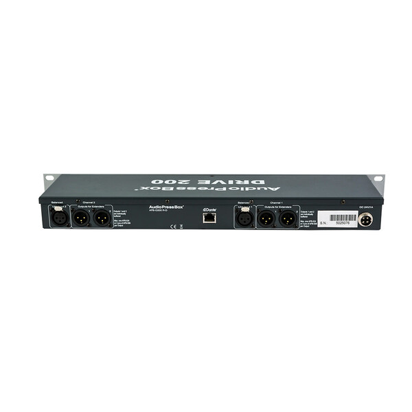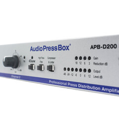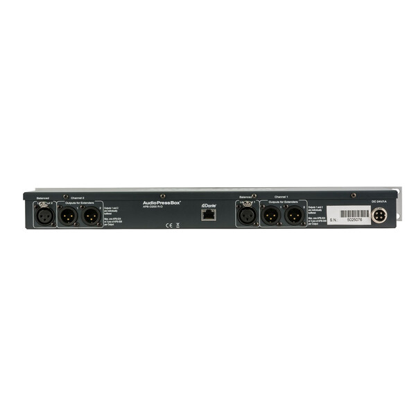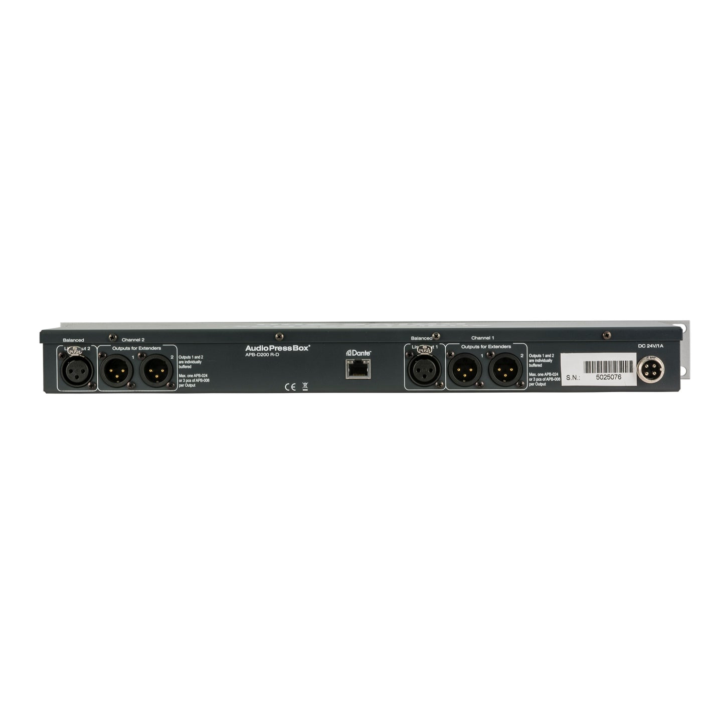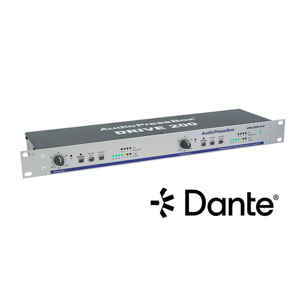 AudioPressBox APB-D200 RD разполага с аналогови и Dante входове с висококачествени цифрово - аналогови преобразуватели.AudioPressBox APB-D200 RD. Както при другите Dante продукти, свободно достъпното софтуерно приложение Dante Controller се използва за автоматично откриване и конфигуриране на устройства APB-Dante, свързани към мрежата Dante. Имената на устройствата, етикетите на каналите, маршрутизирането на сигнала и други параметри (например честота на дискретизация и латентност) могат да бъдат конфигурирани чрез мрежата с помощта на Dante Controller. Продуктите AudioPressBox-Dante използват Power over Ethernet (PoE). Захранването може да бъде осигурено чрез Ethernet кабел от PoE-съвместим мрежов комутатор или от отделен PoE инжектор. PoE консумация на енергия: < 2 вата. Ако използвате PoE инжектор, той трябва да е съвместим с IEEE 802.3af. Използването на несъвместим PoE инжектор може окончателно да повреди устройството и да анулира гаранцията. Професионален активен 19'' rack AudioPressBox Drive unit е основно устройство за: Audio Press Box APB-008 SB-EX, AudioPressBoxAPB-008 IW-EX, AudioPressBoxAPB-008 OW-EX, AudioPressBoxAPB-008 FB-EX, AudioPressBoxAPB-024 R-EX, AudioPressBoxAPB-P008 OW-EX, AudioPressBoxAPB-P008 IW-EX.