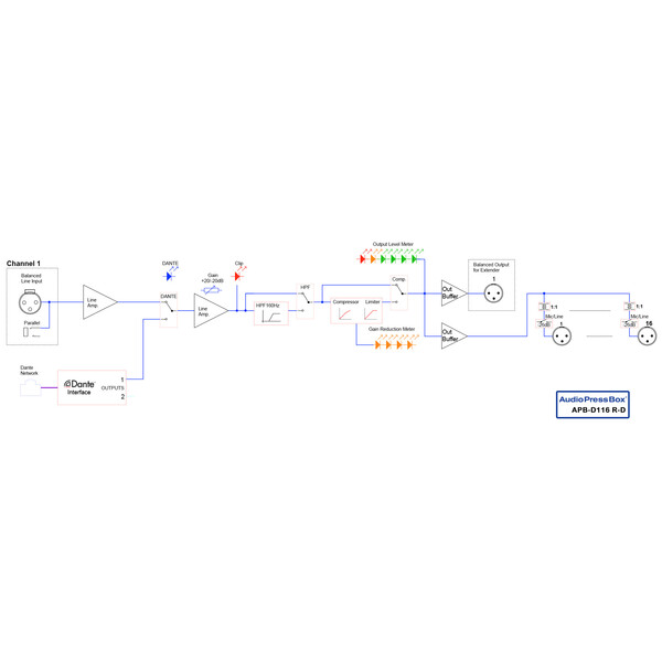 AudioPressBoxAPB-D116 RD е 1-канален активен основен модул, разполагащ с 1 аналогов и Dante вход с висококачествен цифрово-аналогов преобразувател. Можете да превключвате между Line или Dante вход, в зависимост от вашите нужди. Продуктите на APB-Dante използват Power over Ethernet (PoE). Захранването може да бъде осигурено чрез Ethernet кабел от PoE-съвместим мрежов комутатор или от отделен PoE инжектор. PoE консумация на енергия: < 2 вата .ВНИМАНИЕ – Ако използвате PoE инжектор, той трябва да е съвместим с IEEE 802.3af. Използването на несъвместим PoE инжектор може окончателно да повреди устройството и да анулира гаранцията.