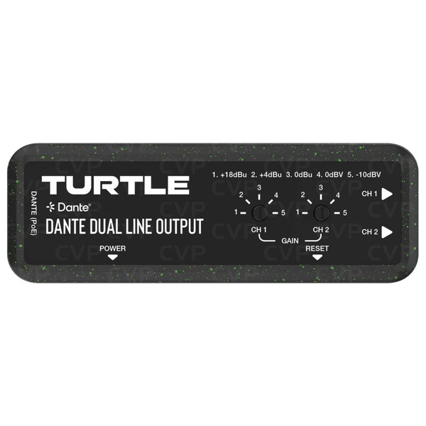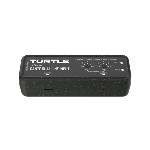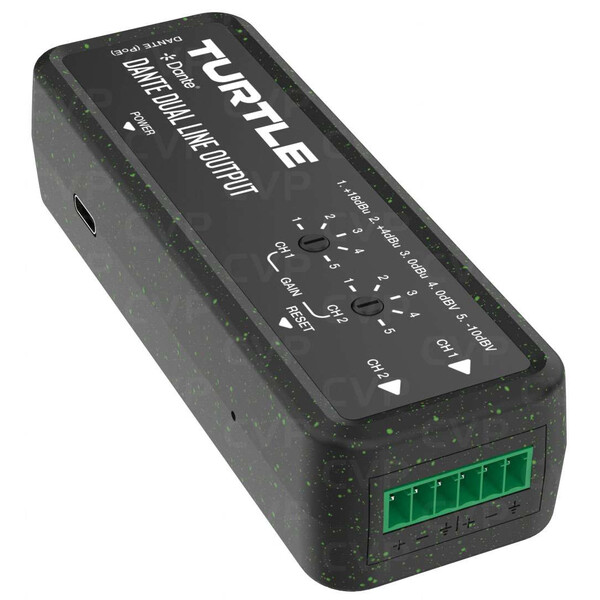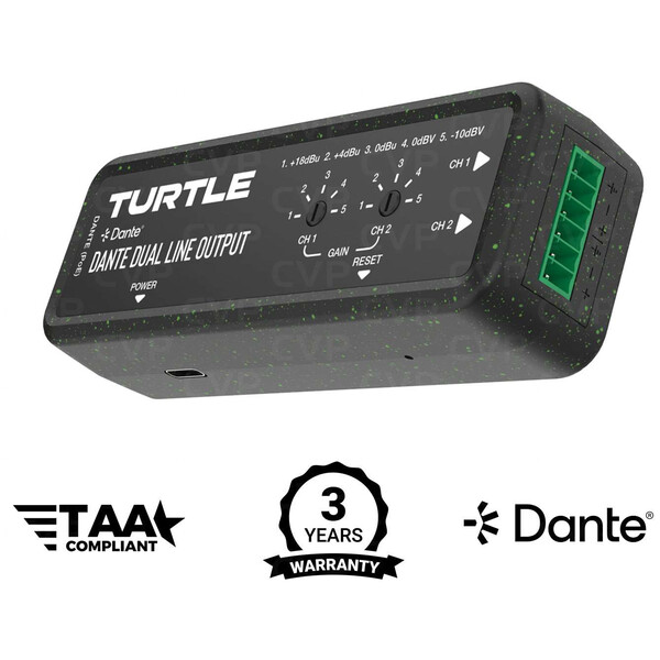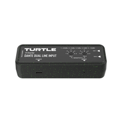 Dante Adapter Turtle 2CH Analog Line Input Adapter with Gain Controls дава възможност за преобразуване на двуканално аналогово аудио към 2CH цифрово аудио на Dante.