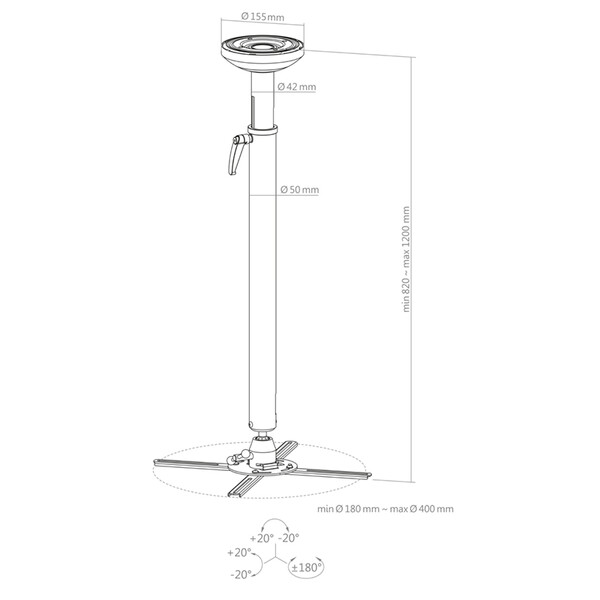 Hagor Beamfix II 820 – 1200 мм e таванна стокйа за мултимедиен проектор произведена в Германия. Стойката е универсално решение за монтаж на таван на почти всички предлагани на пазара проектори. Плочата за монтаж на тавана осигурява стабилно захващане, за да държи таванния държач на проектора сигурно и за дълго време на място. Максималното натоварване е 10 кг. Благодарение на гъвкаво регулируемите монтажни рамена, можете да достигнете до всяка точка на закрепване на устройството, което ще се монтира. Монтажните рамена могат да бъдат с различен диаметър между минимум Ø 180 мм и максимум Ø 400 мм Стойката може да се завърта на 360° с инструменти и може да се накланя и завърта с ±20°, което позволява лесно и прецизно подравняване с проекционната повърхност. Разстоянието до тавана може да се регулира между 820 и 1200 мм и може лесно да се заключи с помощта на практична въртяща се дръжка. Кабелното прокарване е скрито в телескопичната тръба. Повърхността на стойката е обработена с прахово покритие в бяло, устойчиво на удар и надраскване.