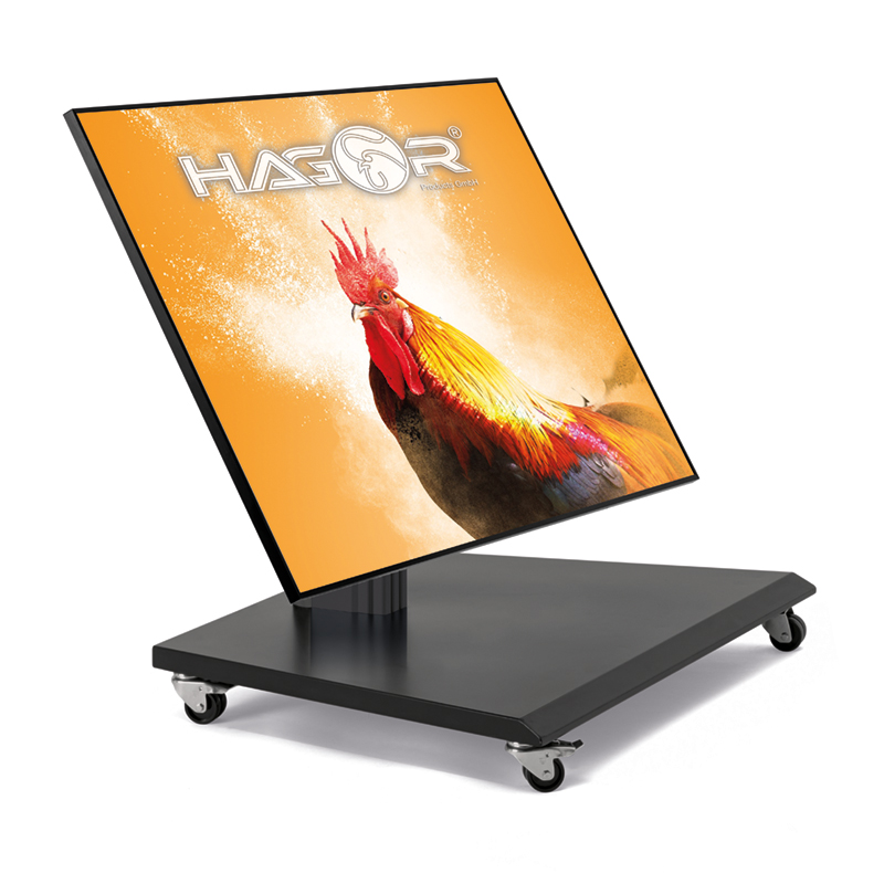 Hagor BrackIT Stand low tilt е мобилна ниска стойка произведена в Германия. Стойката е с нисък наклон и е предназначена за дисплеи с диагонал на екрана от 32" до 55“ или от 81см. до 140 см. VESA размерът е до максимум 400 x 400 мм. Дисплеят се позиционира само в пейзажен формат. Височината на системата е 493 мм, но това важи само за дисплеи с центрирано разположение на отворите. В случай на децентрализирано VESA разположение, трябва да се използва компенсиращ адаптер. Благодарение на въртящите се дръжки отстрани, ъгълът на наклона на дисплея може да се регулира безстепенно и да се фиксира от 0 до 90° с инструменти. Стабилните колелца на количката са оборудвани със спирачки тип „заключване“ и осигуряват безопасно позициониране на желаното място. Капак за кабели на гърба на колоната държи кабелите скрити. Повърхностите са покрити с устойчиво на удар и надраскване прахово покритие в черно. Максималното натоварване е 30 кг.