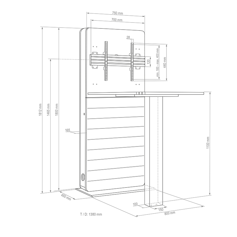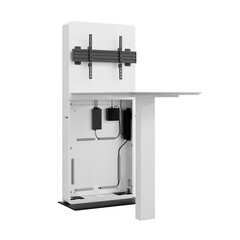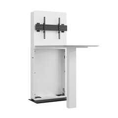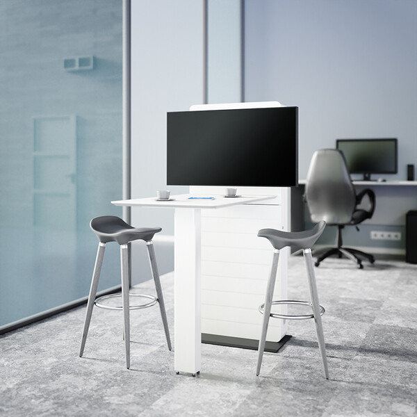 Hagor CON-Line FS Table 32" – 55″ е свободностояща медйна колона произведена в Германия. Стойката е комбинирана с площ за работна маса и предлага оптимизирано масто за срещи дори в най - тесните офис пространства. Hagor CON-Line FS Table 32" – 55″ е идеално решение за срещи, брейнсторминг сесии или групови дискусии. Благодарение на компактния си дизайн, тя може да бъде поставена почти навсякъде в офиса. Подходяща е за дисплеи с размер от 32" до 55“ или диагонал от 81см. до 140см.VESA стндартът е максимум 600 x 400 мм. Дисплеят се монтира само в пейзажна ориентация. Свалящата се монтажна плоча за AV оборудване прави монтажа бърз и лесен. Вентилационните решетки в корпуса осигуряват достатъчна вентилация. AV оборудването е защитено зад предния панел с магнитно заключване. Прибиращите се заключващи механизми от двете страни на корпуса осигуряват допълнителна сигурност. Устойчивата на накланяне основна плоча в комбинация с решението за маса осигурява стабилна стойка – и двете имат регулируеми крачета, които позволяват нивелиране. Максималното натоварване е 50 кг. Възможни са и други цветове на корпуса като допълнителна опция.
