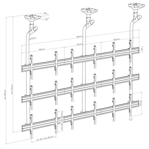 Hagor CPS Videowall C3x3 е произведена в Германия стойка за LED стена. Hagor CPS Videowall C3x3 е част от серията цялостни решения comPROnents®. Решението е за цялостен таванен монтаж на LED стена 3х3 в пейзажна ориентация с размер на панела от 46" до 50" или диагонал от 117 см до 127 см. Отделните стойки на панелите предлагат възможност за регулиране на нивото в дълбочина и височина чрез отделно фино регулиране. По ширина панелите могат лесно да се местят и регулират по алуминиевите релси. VESA монтажа поддържа от 200 x 200 до максимум 600 x 400 мм. Общата ширина е 3009 мм; ако е необходимо, дължината на релсата може да бъде скъсена. Таванният монтаж има компенсация на теглото. В зависимост от теглото на всеки панел се избират различни точки за монтаж. В резултат на това панелите висят изправени. Окабеляването е организирано и здраво закрепено в стълбовете и чрез кабелни скоби по протежение на релсите. Максималната товароносимост е 40 кг / на панел. Повърхността на стойката е защитена от надраскване и удар. Цялостните решения от серията Hagor comPROnents® могат да се комбинират и разширяват с компонентите без ограничения и по този начин предлагат допълнителни възможности за приложение.
