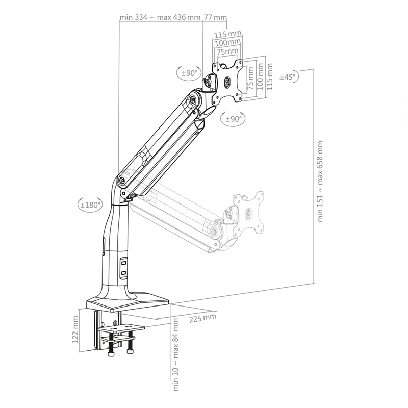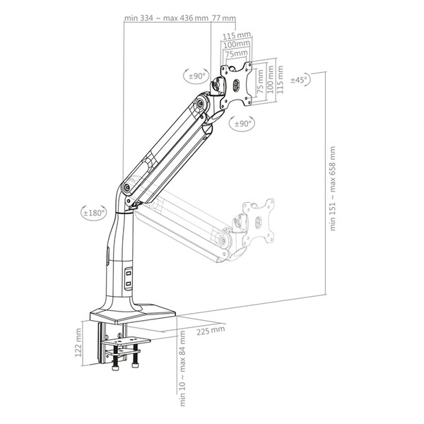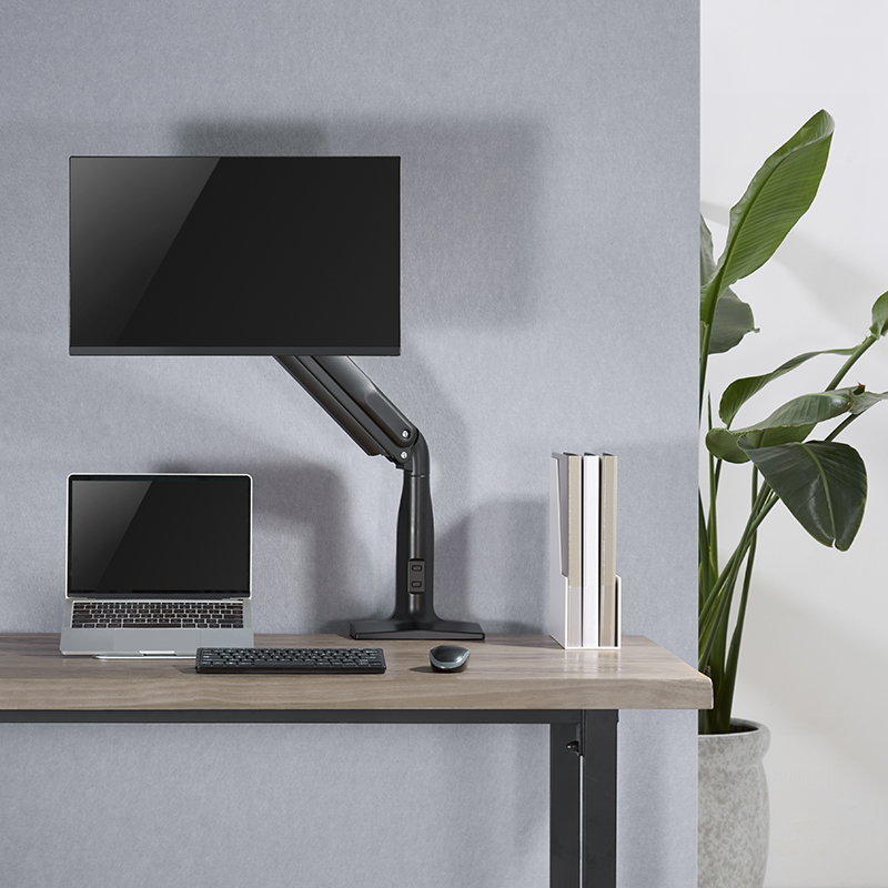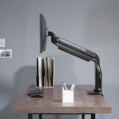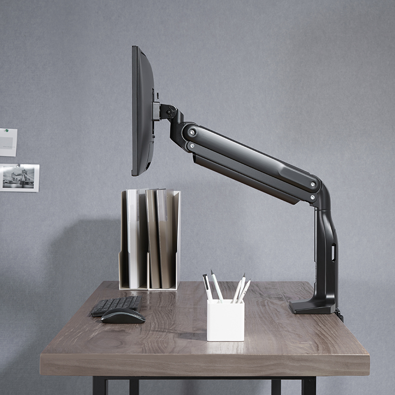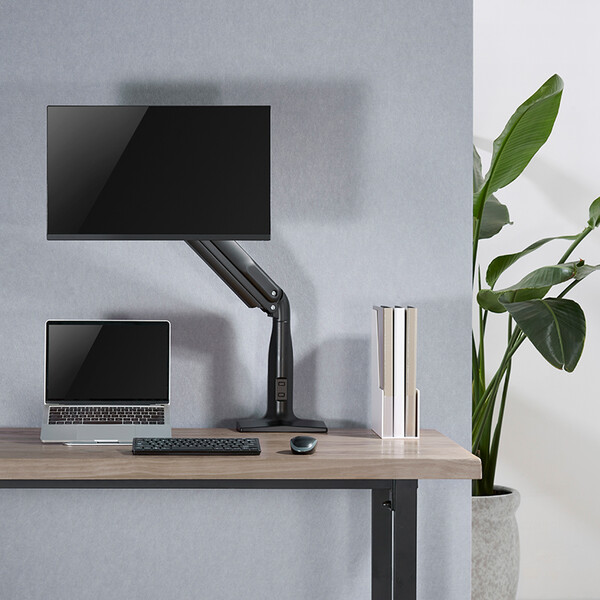 Hagor Gasliftarm Single е произведена в Германия подвижна стойка за монитор от 17" до 43" или диагонал от 43 см до 109 см. Конструкцията е изработена от висококачествен, издръжлив алуминий. Стойката предлага пълна подвижност благодарение на плавно движещите се газови пружини. Стойката се саморегулира според теглото на монитора. Мониторът може да се мести без усилие във всяка желана позиция само с върха на пръста. Ъгълът на наклон е променливо регулируем ±45°. VESA размера на Hagor Gasliftarm Single поддържа монитори с размери 75 x 75 и 100 x 100 мм. В комплекта е включен и адаптер за VESA 200 x 100 мм. Това прави стойката за маса идеална и за по-големи монитори. Кабелите на вградените компоненти могат да бъдат скрити по въртящите се рамена и фиксирани със скоби. Възможно е закрепване чрез скоби или винтове през плота на масата без да се налага пробиване. Повърхността на алуминиевата стойка е обработена с прахово покритие в черно, устойчиво на удар и надраскване.