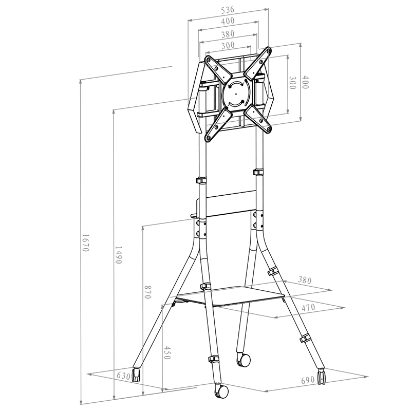 VESA 200 x 200 мм (монтаж върху основната плоча), 300 x 300 мм, 400 x 400 мм