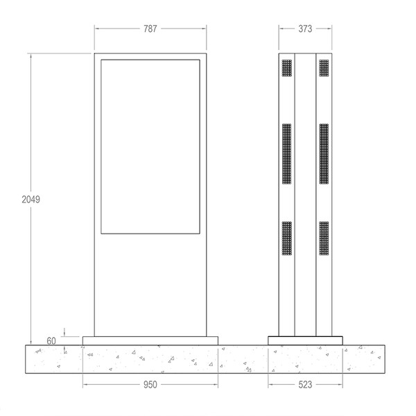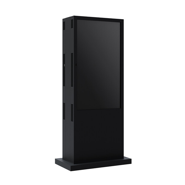 Hagor ScreenOut Pro LG XE4 55″ Back-to-Back е тотемна стойка произведена в Германия. Стойката е предвидена за създаване на дигитален тотем с две страни чрез вграждането на два външни професионлани дисплея LG XE4 55". Материалът и покритието на Hagor ScreenOut Pro LG XE4 55″ Back-to-Back е силно устойчиво на всички външни атмосферни фактори - прах, влага, вода, темперетура. Дисплеите на LG от серията XE4 са водоустойчиви и прахоустойчиви съгласно стандарта IP56 и могат да се използват при температури на околната среда от -30°C до +50°C. Освен това, предната част на дисплея е изработена от 5 мм дебело, здраво защитно стъкло, сертифицирано с IK-10 (IK = европейско ниво на удароустойчивост). Стойката е проектирана съобразно спецификата за монтаж на дисплеите LG XE4 55". Сглобяването се извършва в портретна ориентация. Стандартната версия на външния тотем е проектирана за постоянен монтаж с помощта на фундамент, като Hagor предоставя чертеж с размери на необходимата схема на отворите. Прокарването на кабела е сигурно и скрито вътре в тотема. Кабелният изход, разположен в основата, предпазва надеждно от неоторизиран достъп. Повърхностите са покрити с устойчиво на корозия, силно устойчиво на атмосферни влияния пластмасово прахово покритие в черно (RAL 9005).
