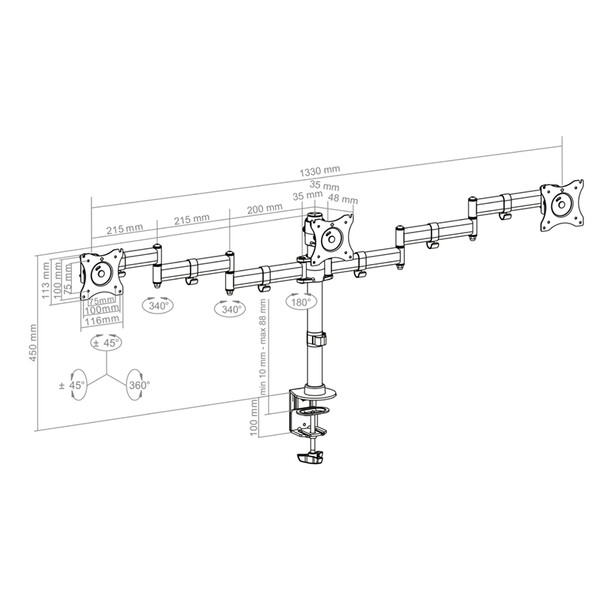 Специални характеристики: промяна на ориентацията на монитора по всяко време, скрито прокарване на кабелите по рамената, фиксиране чрез скоби, монтаж на плот със скоби или винтове.
