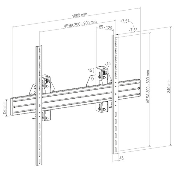 - VESA 300 x 300 мм, 400 x 400 мм, 600 x 400 мм,600 x 600 мм, 800 x 600 мм, 800 x 800 мм,900 x 600 мм, 900 x 800 мм.