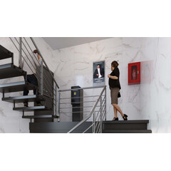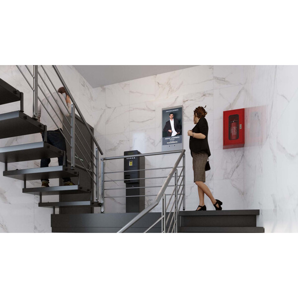 Монтаж на стената пред асансьора. Дисплей Invite 15 Stainless Steelе изключително подходящ за инсталация освен вътре в асансьора, така и на стената пред него. Инсталацията на два дисплея Invite 15 - пред и вътре в асансьора завършва визията на тази зона от бизнес сградата, както създава повече възможности за визуализация на информация и рекламни послания към посетителите.