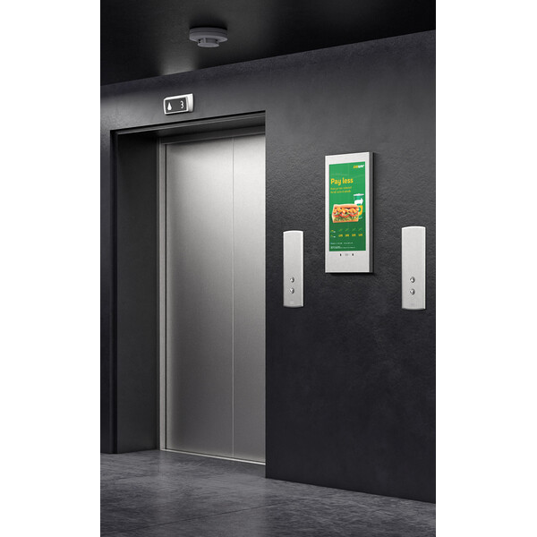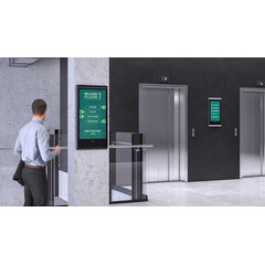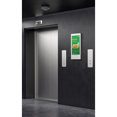 Монтаж на стената пред асансьора. Дисплей Invite 24 е изключително подходящ за инсталация освен вътре в асансьора, така и на стената пред него. Инсталацията на два дисплея Invite 15 - пред и вътре в асансьора завършва визията на тази зона от бизнес сградата, както създава повече възможности за визуализация на информация и рекламни послания към посетителите.