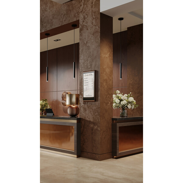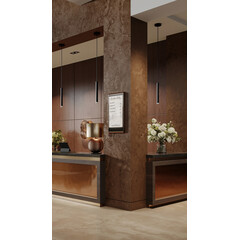 Монтаж на стената пред асансьора. Дисплей Invite 27 е изключително подходящ за инсталация освен вътре в асансьора, така и на стената пред него. Инсталацията на два дисплея Invite 27 - пред и вътре в асансьора завършва визията на тази зона от бизнес сградата, както създава повече възможности за визуализация на информация и рекламни послания към посетителите.