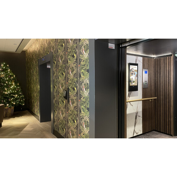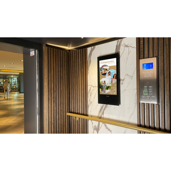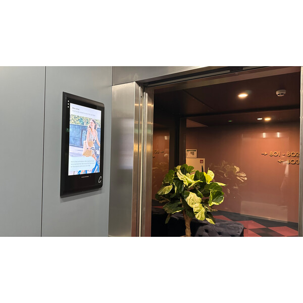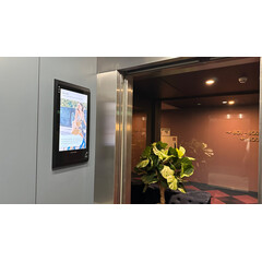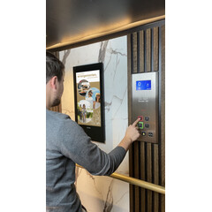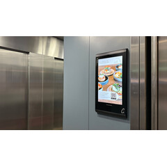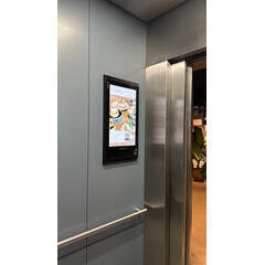 Монтаж на стената пред асансьора. Дисплей Invite 32 е изключително подходящ за инсталация освен вътре в асансьора, така и на стената пред него. Инсталацията на два дисплея Invite 32 - пред и вътре в асансьора завършва визията на тази зона от бизнес сградата, както създава повече възможности за визуализация на информация и рекламни послания към посетителите.