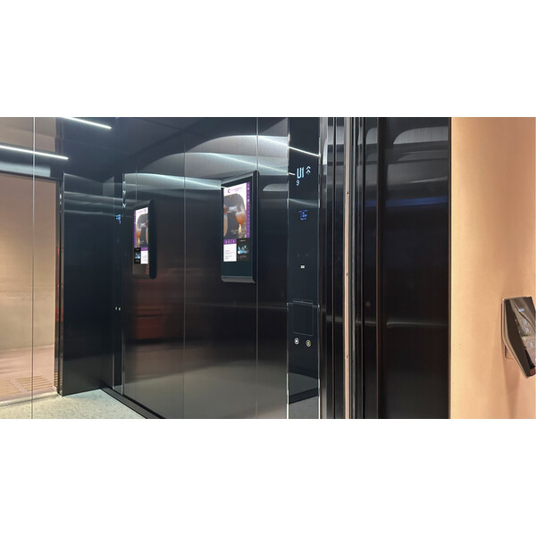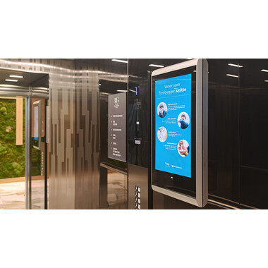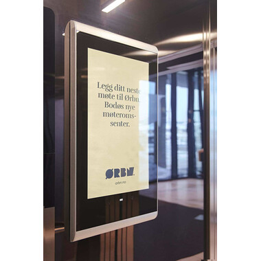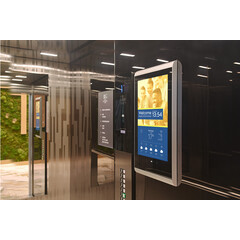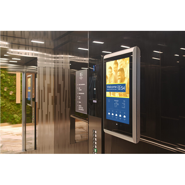 Монтаж на стената пред асансьора. Дисплей Invite 55 е изключително подходящ за инсталация освен вътре в асансьора, така и на стената пред него. Инсталацията на два дисплея Invite 55 - пред и вътре в асансьора завършва визията на тази зона от бизнес сградата, както създава повече възможности за визуализация на информация и рекламни послания към посетителите.