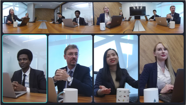 Комбиниран режим. В лявата част е говорещият участник, докато дясната визуализира цялата стай с останалите участници.