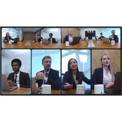 Режим на дискусия. Горната част на изображението е общия план на залата, докато долната фокусира върху говорещия и предоставя индивидуален изглед на всеки участник.
