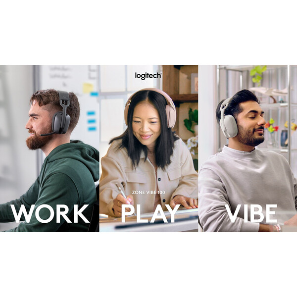 Work. Connect. Vibe. Бизнес клас безжични слушалки Logitech Zone Vibe Wireless са специално проектирани и създадени за натоварена ежедневна употреба. Logitech Zone Vibe Wireless притежават стилен и лек дизайн, гарантиращ комфорт през целия ден. Оборудвани са с двойни шумопотискащи микрофони, които осигуряват отлично качество на звука. Плюс многоточков Bluetooth позволяващ безпроблемното превключване между две активни устройства.