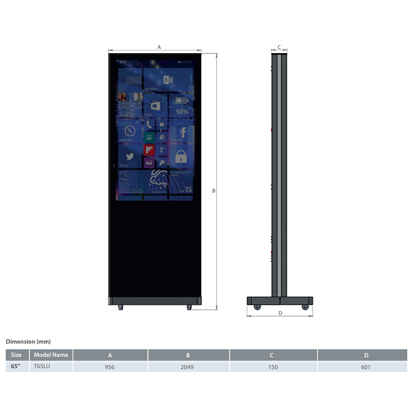 Lunos T65LU е свободностоящ дигитален информационен киоск или тотем. Решението е подходящо за реклама в търговски обекти, информационни центрове, летища, гари, музеи, държавни институции, обществени пространства и хотели. Дигитален тотем Lunos T65LU има разновидност с добавена сензорна функция Lunos T65LU-T както и двустранен вариант без сензорна функционалност Lunos Double Sided T65LU-D. Решението за дигитална реклама или дигитална табела има възможност за вграждане на компютър с високопроизводителен плейър и използване на софтуер за визуализация на изображенията, с което се превръща в напълно завършено решение за дигитална реклама и презенетиране на информация. Lunos T65LU - 65" дигитална табела е със свободностоящ дизайн с опция за закрепване към пода. Електрическото захранване и подаване на данни се осъществява от задния панел или през подовата плоча. Дигитален информационен павилион Lunos T65LU е защитен със заключваща се обслужваща врата за достъп. Елегантният и функционален дизайн на дигитален тотем 65" Lunos T65LU се постига с впечатляваща алуминиева рамка и преден панел от вандалоустойчиво закалено стъкло.