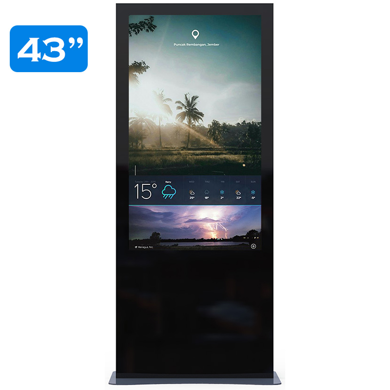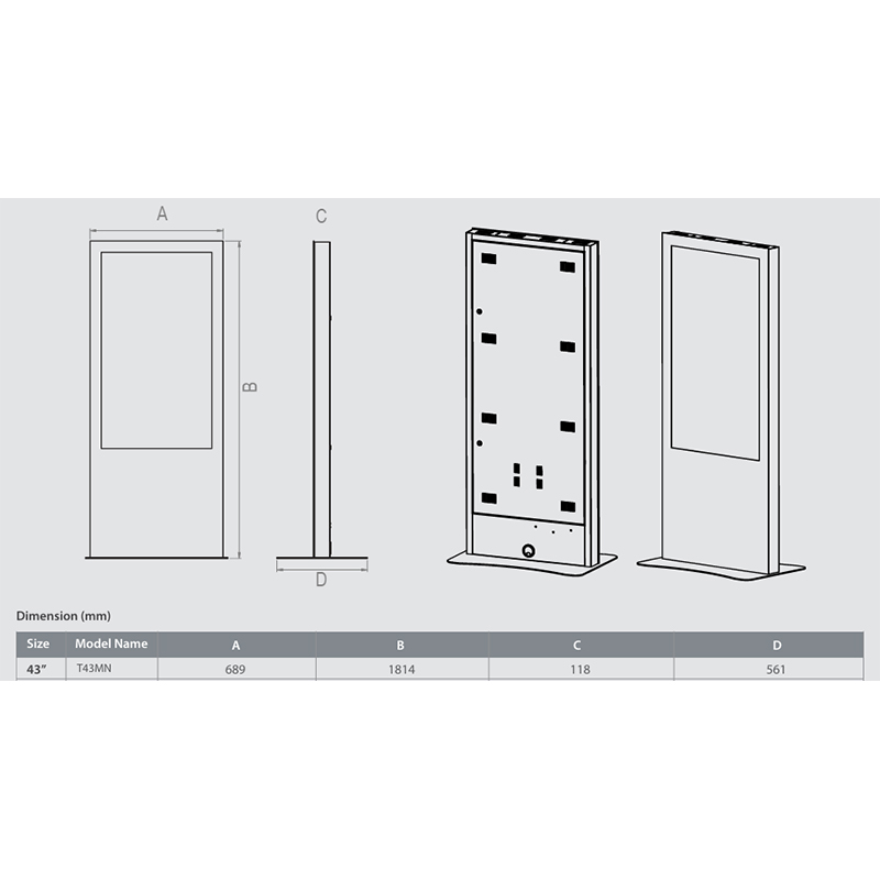 Minerra T43MN5 е свободностоящ дигитален информационен киоск или тотем. Решението е подходящо за реклама в търговски обекти, информационни центрове, летища, гари, музеи, държавни институции, обществени пространства и хотели. Дигитален тотем Minerra T43MN5 има възможност за добавяне на сензорна функция. Решението за дигитална реклама или дигитална табела има възможност за вграждане на компютър с високопроизводителен плейър и използване на софтуер за визуализация на изображенията, с което се превръща в напълно завършено решение за дигитална реклама и презенетиране на информация. Цвета на външния дизайн е по избор. Minerra T43MN5 - 43" дигитална табела е със свободностоящ дизайн с опция за закрепване към пода. Електрическото захранване и подаване на данни се осъществява от задния панел или през подовата плоча. Дигитален информационен павилион Minerra T43MN5 е защитен със заключваща се обслужваща врата за достъп. Елегантният и функционален дизайн на дигитален тотем 43" Minerra T43MN5 се постига с впечатляваща алуминиева рамка и преден панел от вандалоустойчиво закалено стъкло. Други размери от серията дигитални табели Minerra са моделите: 50" Minerra T50MN5, 55" Minerra T55MN5, 65" Minerra T65MN5.