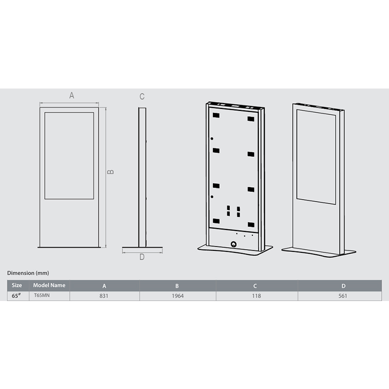 Minerra T65MN5 е свободностоящ дигитален информационен киоск или тотем. Решението е подходящо за реклама в търговски обекти, информационни центрове, летища, гари, музеи, държавни институции, обществени пространства и хотели. Дигитален тотем Minerra T65MN5 има възможност за добавяне на сензорна функция. Решението за дигитална реклама или дигитална табела има възможност за вграждане на компютър с високопроизводителен плейър и използване на софтуер за визуализация на изображенията, с което се превръща в напълно завършено решение за дигитална реклама и презенетиране на информация. Цвета на външния дизайн е по избор. Minerra T65MN5 - 65" дигитална табела е със свободностоящ дизайн с опция за закрепване към пода. Електрическото захранване и подаване на данни се осъществява от задния панел или през подовата плоча. Дигитален информационен павилион Minerra T65MN5 е защитен със заключваща се обслужваща врата за достъп. Елегантният и функционален дизайн на дигитален тотем 65" Minerra T65MN5 се постига с впечатляваща алуминиева рамка и преден панел от вандалоустойчиво закалено стъкло. Други размери от серията дигитални табели Minerra са моделите: 43" Minerra T43MN5, 50" Minerra T55MN5, 55" Minerra T55MN5.