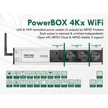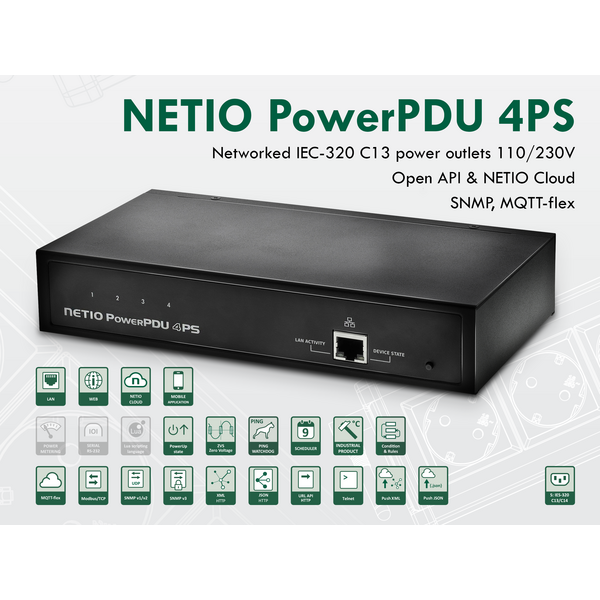 Netio Power PDU 4PS EU е интелигентен PDU (разпределителен блок за захранване) с четири електрически контакта (4x IEC-320 C13). Всеки изход може да се включва/изключва индивидуално. Netio PowerPDU 4PS може да се монтира в стелажни шкафове – хоризонтално, вертикално или като 1U устройство. Интегрирането в системи на трети страни, използващи различни протоколи (JSON, Modbus/TCP, SNMP, MQTT-flex, Telnet, ...) е лесно благодарение на отворения API. С услугата Netio Cloud изходите могат да се контролират отвсякъде. Услугата Netio Cloud, предоставяна срещу заплащане, използва SSL сигурност и сървъри в Европа.
