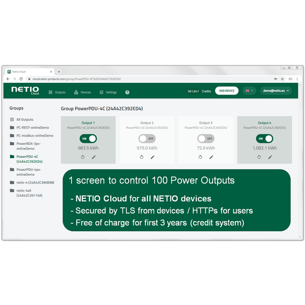 - Изходите на множество устройства могат да се управляват централно с помощта на услугата Netio Cloud (срещу заплащане).