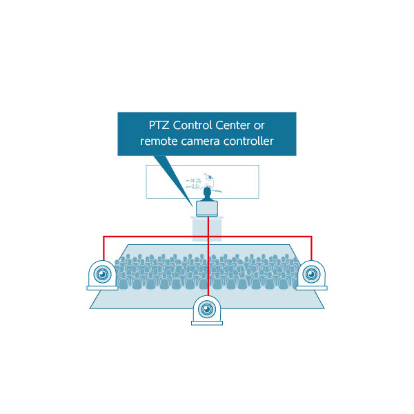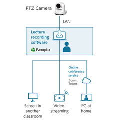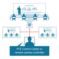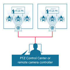 - Един компютър или контролер може да управлява и контролира множество камери. При използване на PTZ камери е необходимо да се проверят местата им за монтаж и съвместимостта на добавената система. Panasonic AW-HE20WE е компактно решение, така че няма да пречи дори ако е инсталирана на тясно място. Конферентна камера Panasonic AW-HE20KE може директно да замени съществуваща PTZ камера Panasonic. Варианти: При използване на няколко камери в една стая,поточно предаване на видео едновременно към множество отдалечени класни стаи, при работа и управление на камери в множество класни стаи от контролната зала.