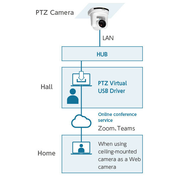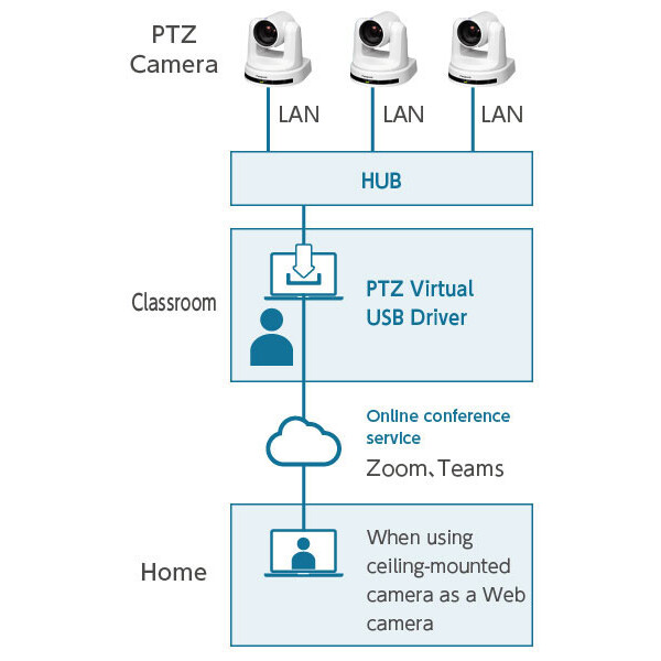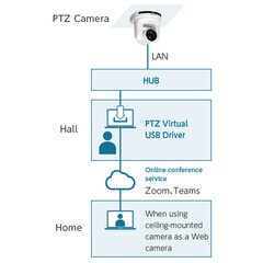 - Panasonic AW-HE20KE като USB камера. Panasonic AW-HE20WE поддържа UVC, така че може да се използва със съществуваща USB-базирана система. Единичен LAN кабел може да се използва за свързване на множество камери към компютър, което позволява спестяване на кабели при инсталиране и конфигуриране на проста и компактна система. Чрез използването на безплатния софтуер PTZ Virtual USB Driver, Panasonic AW-HE20WE може да се използва като уеб камера, която може да се свърже с онлайн конферентна услуга чрез LAN кабел, дори когато USB кабелът не може да достигне мястото за инсталиране на камерата, като например таван.