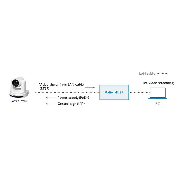 - Лесна инсталация и употреба. Лесното настройване и работа със системата е важно съображение при започването на онлайн конференция или онлайн клас. PTZ камера Panasonic AW-HE20WE може да бъде свързана към различни видове системи с просто окабеляване - към редовно използван компютър или дистанционен контролер на камерата, така че дори хора, които не са запознати с работата на системата, да могат лесно да работят. Panasonic AW-HE20WE може да бъде свързана към видео оборудване чрез мрежа и използва LAN кабел за предаване на видео, аудио и контролни сигнали, както и захранване. Това не само минимизира риска от проблеми с окабеляването, но също така допринася за намаляване на времето и усилията, необходими за настройка и демонтаж на оборудването.