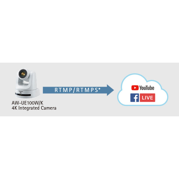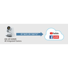 - Директно излъчване през RTMP/RTMPS. RTMP/RTMPS се поддържа, за да позволи директно качване на видео към услуги за стрийминг на живо като YouTube Live и Facebook Live. Това означава, че потокът на живо може да се излъчва директно от Panasonic AW-UE100KEJ.