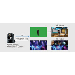 - FreeD Поддръжка за изграждане на AR/VR системи. Интегрирането с AR/VR системи е достъпно чрез FreeD-съвместим команден изход. Информацията за проследяване на Panasonic AW-UE100KEJ (пан/наклон/увеличение/фокус/ирис) се извежда според синхронизиращ сигнал, за да се улесни конфигурацията на виртуални системи без енкодер.