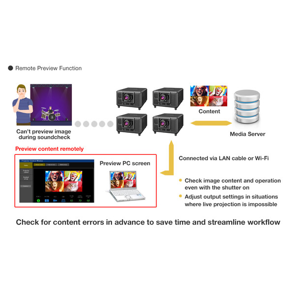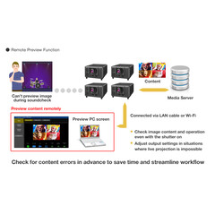 Remote Preview за дистанционен преглед за плавен старт на вашето събитие. Remote Preview позволява на системните интегратори да потвърдят целостта на видеосигнала чрез преглед на миниатюри на входния сигнал на лаптоп преди прожектиране. Достъпен чрез софтуер или уеб браузър, Remote Preview работи с проектора в режим на готовност или с включен затвор. Полезно е при събития като концерти, където възможностите за проверка на съдържанието на екрана са ограничени поради трафика на сцената и други логистични фактори. Remote Preview намалява вероятността от грешки преди изпълнението и ако бъде открита грешка, помага да се стесни възможната причина.