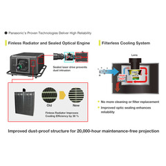 Екранирано лазерно устройство с радиатор без ребра.Херметически затвореният DMD блок, екранираното лазерно устройство и охладителната система без филтър са подсилени от нов радиатор без ребра, който подобрява ефективността на охлаждане с до 30% в сравнение с предишните реализации, като същевременно защитава критичните компоненти от проникване на прах. Проекторът надхвърля общите международни насоки за прахоустойчивост и е произведен в Япония по изключително строги стандарти за контрол на качеството. Бизнес операторите могат да очакват до 20 000 часа надеждна проекция без поддръжка при пълна яркост.
