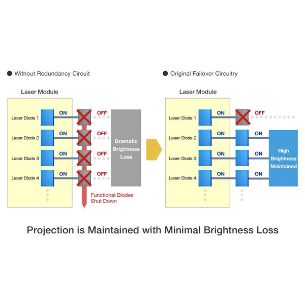 Мултилазерно задвижващо устройство с вериги за резервиране при отказ. Множество лазерни модули са оборудвани с уникалната схема на Panasonic при отказ. Ако един лазерен диод се повреди, само диодите в засегнатата серия се заобикалят, а не всички диоди в модула, какъвто е случаят с някои конкурентни лазерни проектори. Прожекцията продължава без прекъсване с незабележима загуба на яркост. Failover Circuitry добавя още едно ниво на застраховка в ситуации, в които трябва да се поддържа показването на изображението.