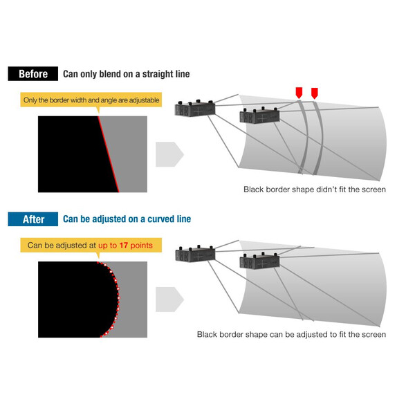 - Гъвкаво регулиране на нивото на черното. Еднаквостта на преливането на ръбовете на извитите екрани е трудно постижимо с базирано на линии регулиране на границата на нивото на черното. Изкривените ръбове на изображението водят до неравномерни ширини на смесване и липсата на еднаквост в припокриващите се области се излага, когато се проектират тъмни сцени. лазерен мултимедиен проектор за 3D mapping Panasonic PT-RQ35KEJ придобива ново калибриране на нивото на черното, което позволява преоформяне на черните граници, за да отговарят на кривината на екрана, като се използват до 17 контролни точки по почти същия начин като нашата функция Free Grid. Съседните изображения могат да бъдат съпоставени в рамките на поле от 0,5 точки – идеално за 4K видео прожектиране – като същевременно е активиран и по-широк диапазон от настройки с по-фини стъпки.