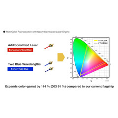 Превъзходно възпроизвеждане на цветовете с червени и сини лазери. Благодарение на разполагането на отделни червени и сини лазерни/фосфорни светлинни източници SOLID SHINE, Лазерен мултимедиен проектор Panasonic PT-RQ50K осигурява усъвършенствано ниво на възпроизвеждане на цветовете, предоставяйки живи и потапящи изображения, които ще ангажират и ще зарадват публиката.