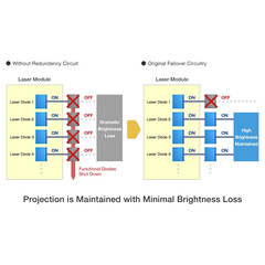Solid-State Laser Modules with Failover Circuitry. Лазерното устройство SOLID SHINE групира лазерните диоди в отделни модули.Ако един единствен диод в модула изгасне, Failover Circuitry позволява диодите в засегнатата серия да бъдат прескочени - останалите, функционални диоди продължават да работят с незабележима загуба на яркост. Ако лазерен диод се повреди в други лазерни проектори, целият модул излиза от строя и загубата на яркост е толкова голяма, че проекторът трябва да бъде изключен. Технологията за преустановяване на лазерен диод на Panasonic добавя още едно върхово ниво на застраховка за прожектиране на събития.