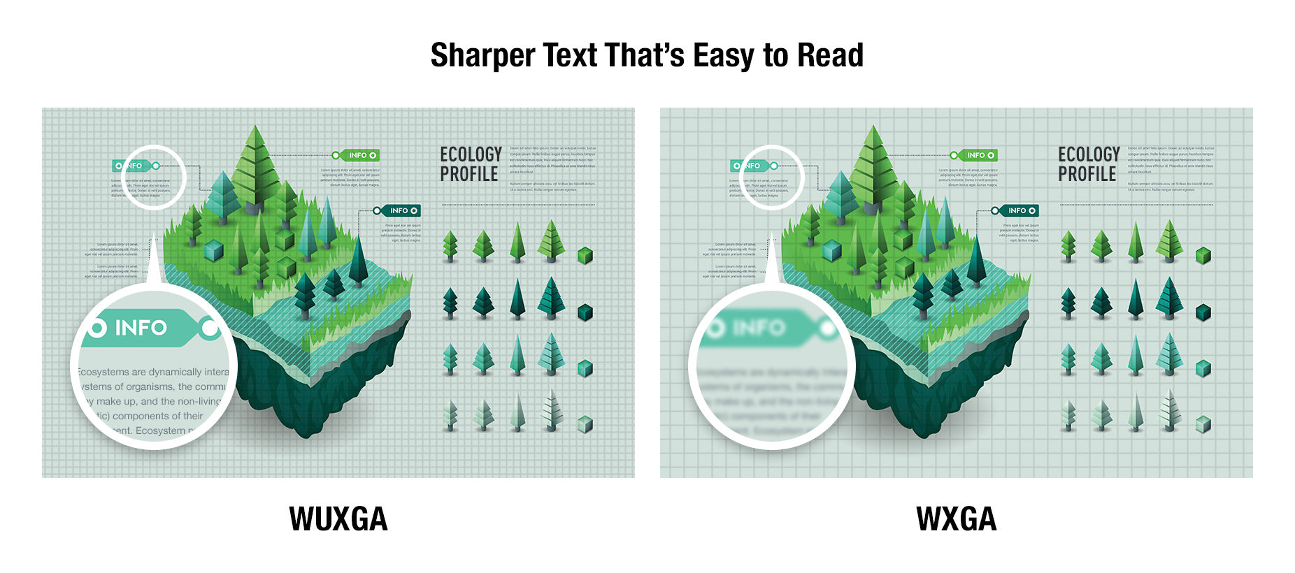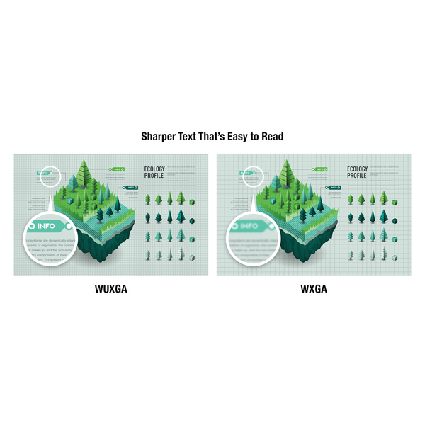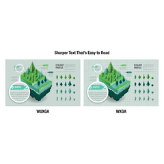 Плавни, отчетливи детайли с WUXGA. Резолюцията на лазерен проектор Panasonic PT-VMZ72 е WUXGA (1920 x 1200) LCD панелите подобряват детайлността за по-впечатляващо и дълбоко изображение. Ръбовете на текста са гладки и лесни за четене, дори за тези, които седят най-далеч от екрана.