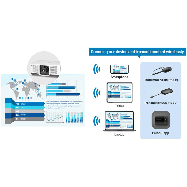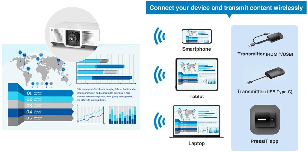 Споделяйте безпроблемно с PressIT. Споделяйте екрана на устройството си безжично и превключвайте свободно между презентаторите. PressIT, опционалната безжична система за презентации на Panasonic, поддържа споделяне на екрана с натискане на бутон. PressIT се състои от предаватели, свързани към вашите устройства , и приемник, свързан към проектора. За по-лесна инсталация захранването се подава през USB порта DC 5 V/2 A на проектора.