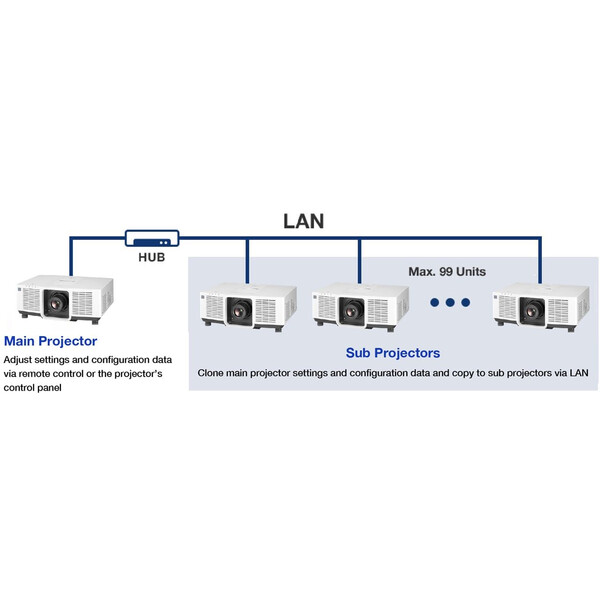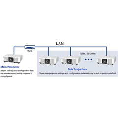Функция за клониране на данни чрез LAN или USB устройства с памет. Въвеждането на едни и същи настройки на всеки проектор от вашия парк може да отнеме много време. За да се ускори тази задача, лазерен мултимедиен проектор Panasonic PT-VMZ72 разполага с функция за клониране на данни, която позволява копирането на настройките на главния проектор, включително запазените данни за настройки, към подпроекторите чрез LAN или USB устройство.