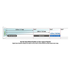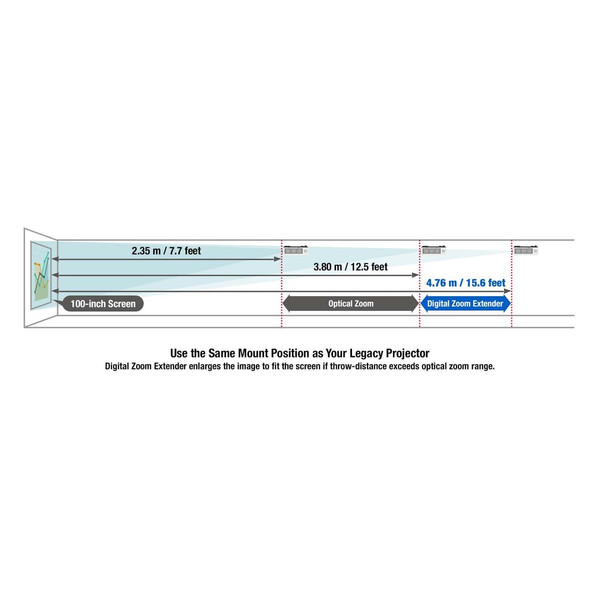 Digital Zoom Extender + Digital Image Shift. Digital Zoom Extender спомага за увеличение на разстоянието на проекция на проектора отвъд обхвата на оптичното увеличение, което прави възможно повторното използване на съществуващ таванен монтаж или инсталирането на проектора по-далеч от екрана, спестявайки монтажни дейности. Цифровото изместване на изображението позволява изображението да се движи до 10% във всяка посока за инсталации извън осите или с висок таван.