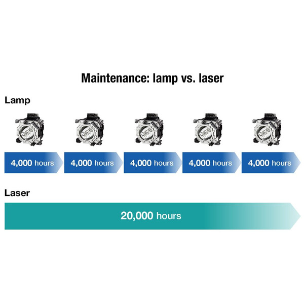 Без поддръжка на светлинния източник в продължение на 20 000 часа. Лазерен мултимедиен проектор Panasonic PT-VMZ72 предлага повече от постоянно, дълготрайно качество на картината. Неговиятлазерен източник на светлина работи около 20 000 часа без поддръжка, превъзхождайки проектори с лампа, които може да изискват няколко смени на лампата за същия период. Това намалява експлоатационните разходи и елиминира изхвърлянето на живачни лампи.