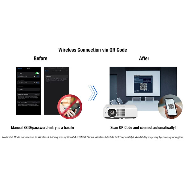 Прожектирайте безжично от вашия смартфон или лаптоп. Споделяйте съдържание безжично от вашия лаптоп или смартфон. Просто сканирайте QR кода, показан в екранното меню, с помощта на камерата на вашия смартфон и устройството ще се свърже автоматично с проектора чрез безжична LAN мрежа, без да се изисква SSID или пароли. Използвайте безплатните безжични приложения на Panasonic , за да излъчвате медийното си съдържание на големия екран.