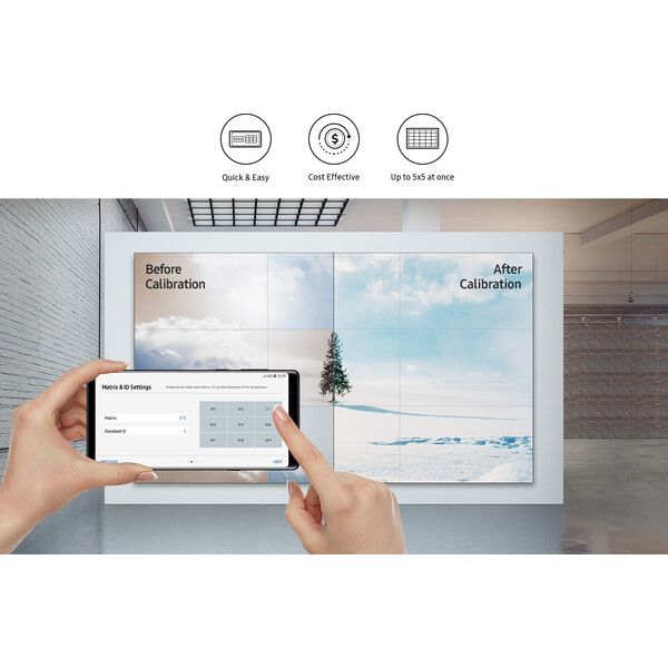 Пълно калибриране на видеостената. Видео панелите на Samsung преминават през многоетапно фабрично калибриране в заводите на производителя. По този начин Samsung гарантира прецизното качество на изображението и възможността потребителя сам да настройва яркостта на цветовете на изображението чрез удобно и лесно за употреба мобилно приложение - Samsung Color Expert Pro.