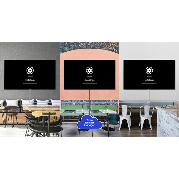Дистанционна настройка и актуализация на софтуера. Tizen Zero Config прави изключително лесно и удобно управлението на множество бизнес телевизори Samsung BECH работещи в различни обекти. След инсталиране на Samsung BEC50H, могат да се регистрират нови приложения чрез Tizen Business Manager и да се инсталират дистанционно, без да се налага пътуване между обектите на място.