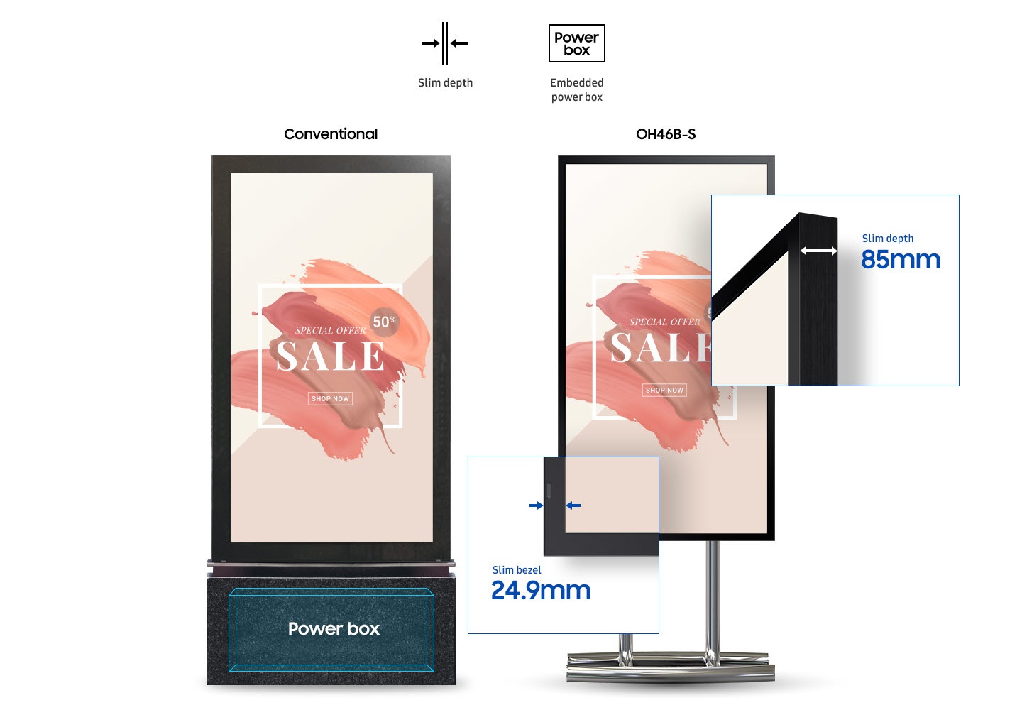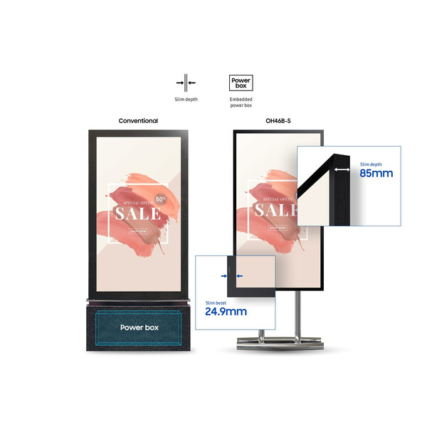 Не на последно място, външен широкоформатен дисплей 46" Samsung OH46B-S предлага елегантен дизайн, благодарение на тънкият му корпус. Дълготрайната работа на външен рекламен екран 46" Samsung OH46B-S е гарантирана с рейтинг IP56, антирефлексна технология, защита срещу повреди и ефективна система за охлаждане. Освен това Samsung OH46B-S разполага с вградено захранване и компактен размер на оперативните компоненти. Всичко това – в един ултратънък корпус.