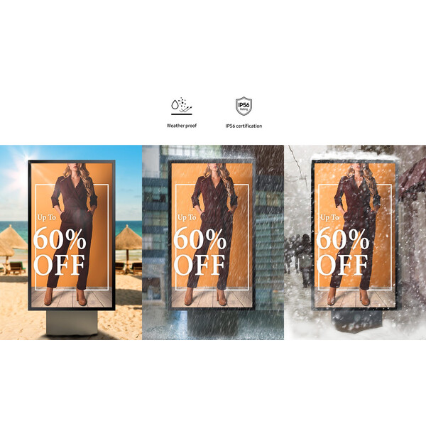 Освен от слънчевата светлина и отблясъци, външен рекламен екран 46" Samsung OH46B-S е защитен от физическо въздействие. Професионален външен дисплей 46" Samsung OH46B-S притежава сертификат IP56 - гарнатиращ здравината и надеждността му.