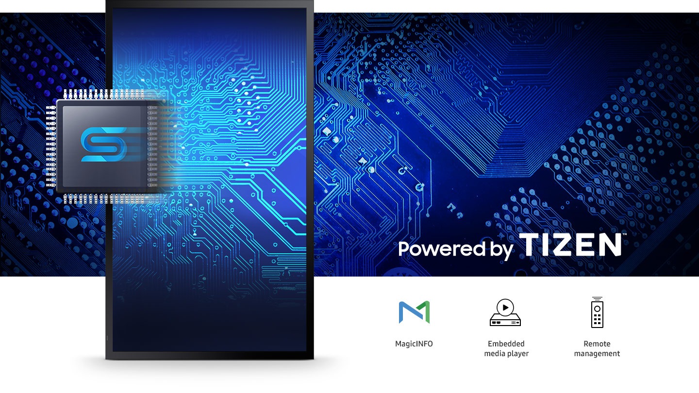- Вграден MagicINFO Player S7. Вграденият пейър за възпроизвеждане на съдържание се поддържа от собствената операционна система Tizen. Чрез тях имате възможност за изключително лесно управление и контрол на излъчването на съдържание на дисплея, както и необходимите му настройки.